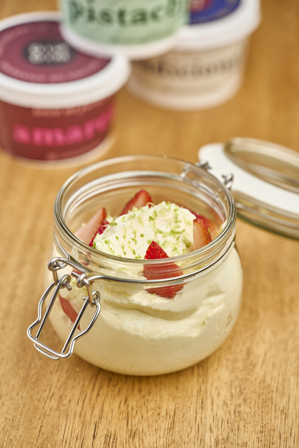 Helado de crema clemente con crema de pistacho tostado, un pesto de pistacho tostado salado y trozos de pistacho tostado con sal marina.