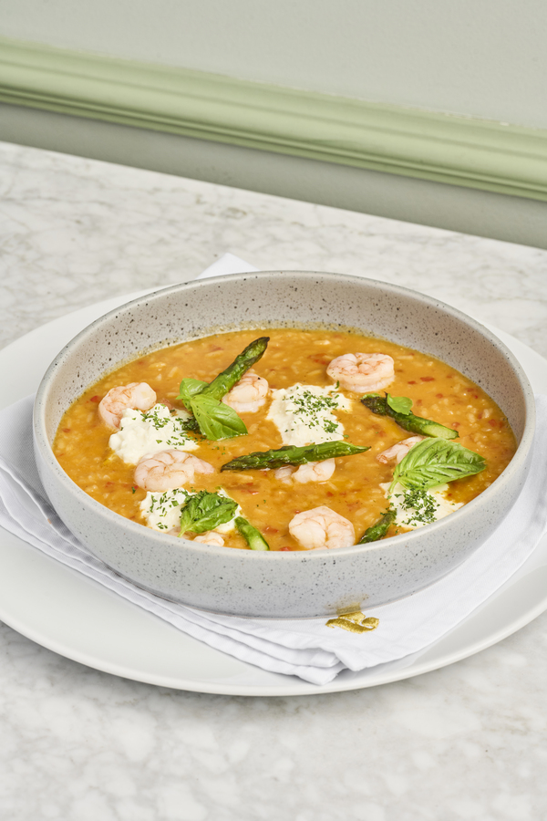 Tostón de plátano, kimchi, camarones, mango.