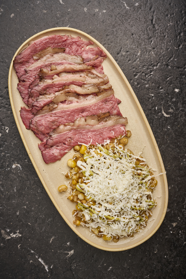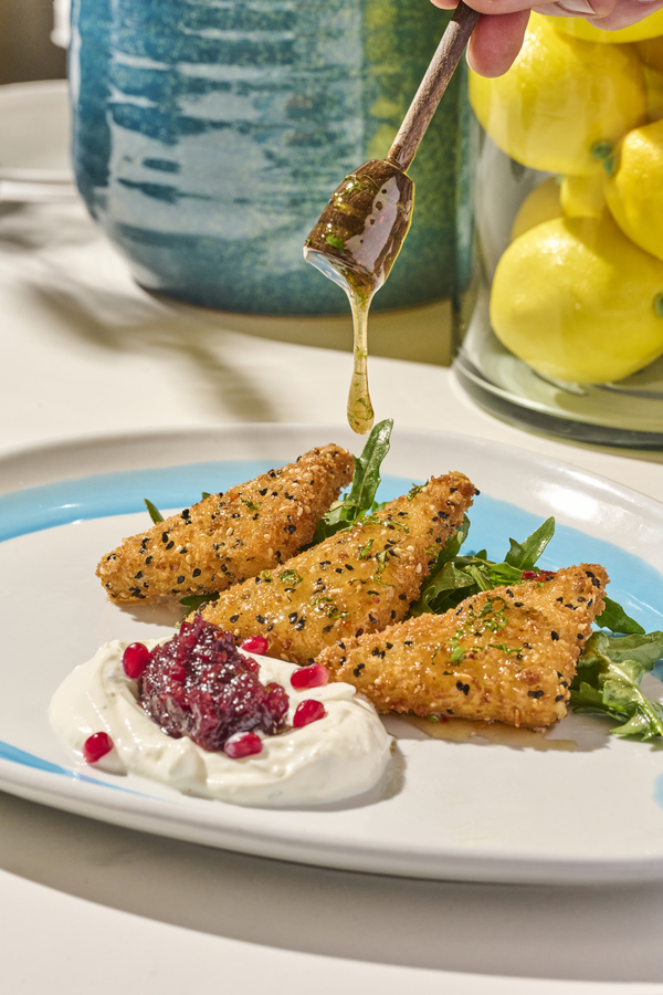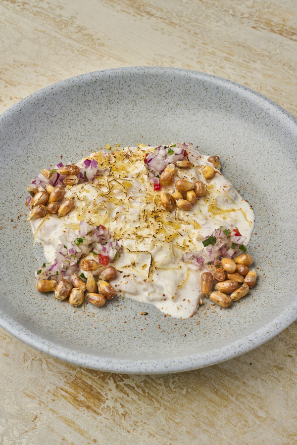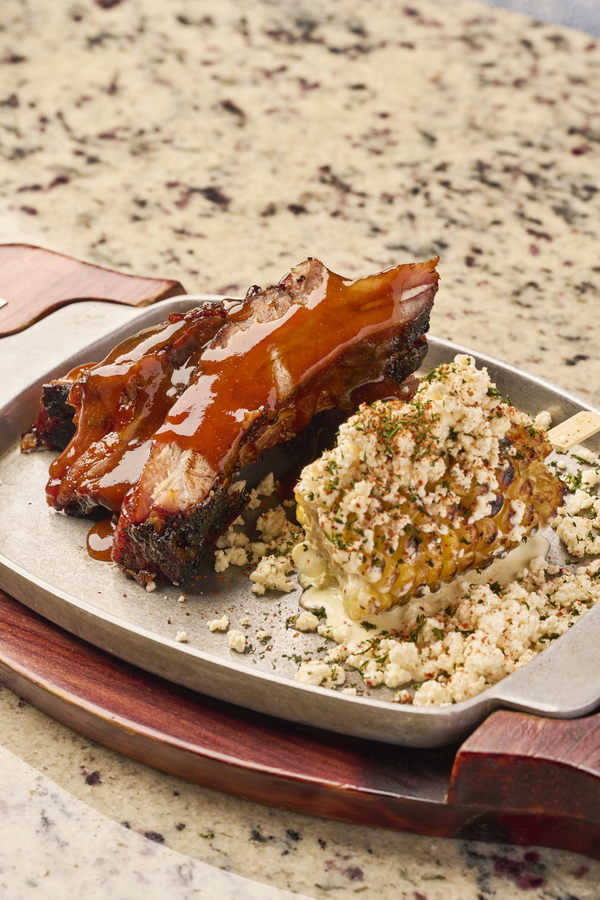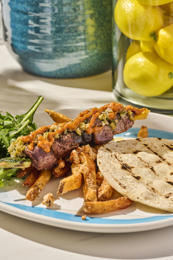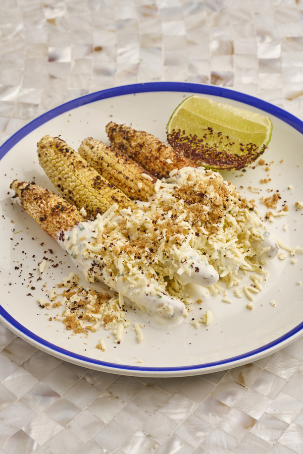 Asadas al carbón, labneh, salsa de ajo, queso blanco, crumble de pita crocante y sal de sumac.