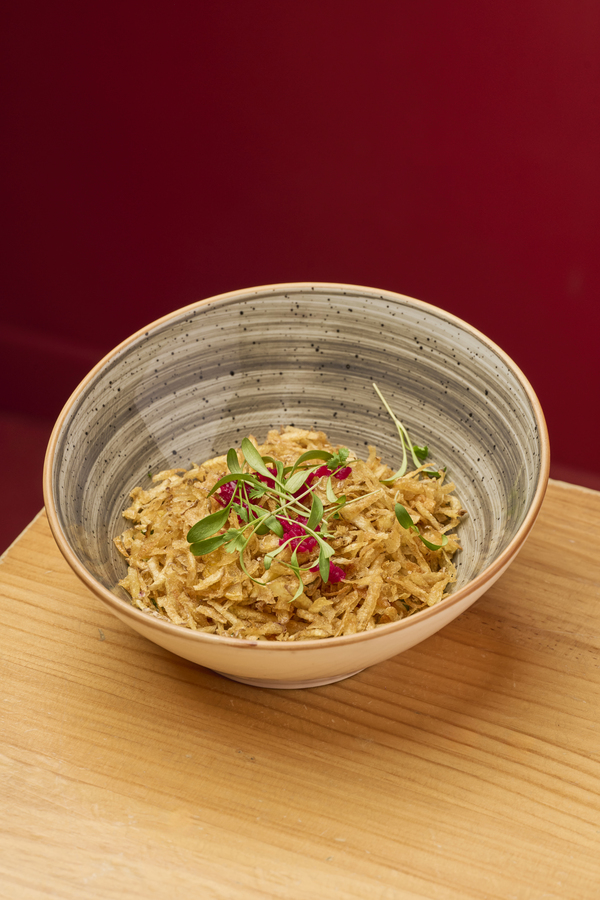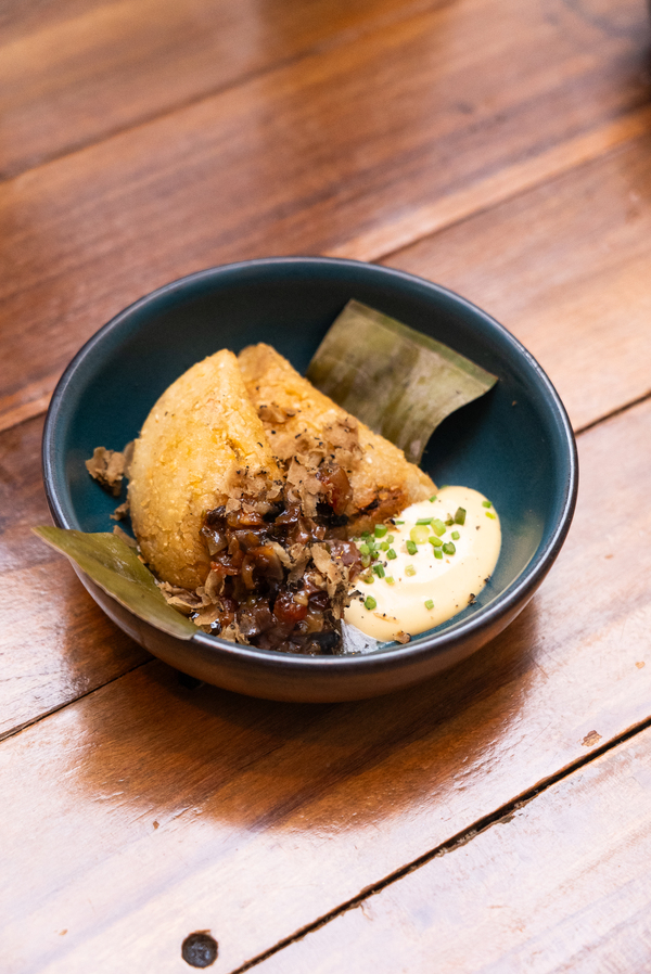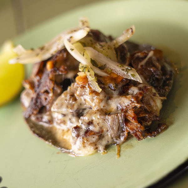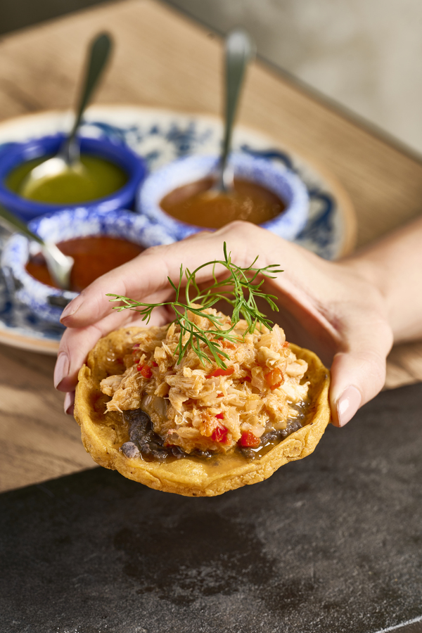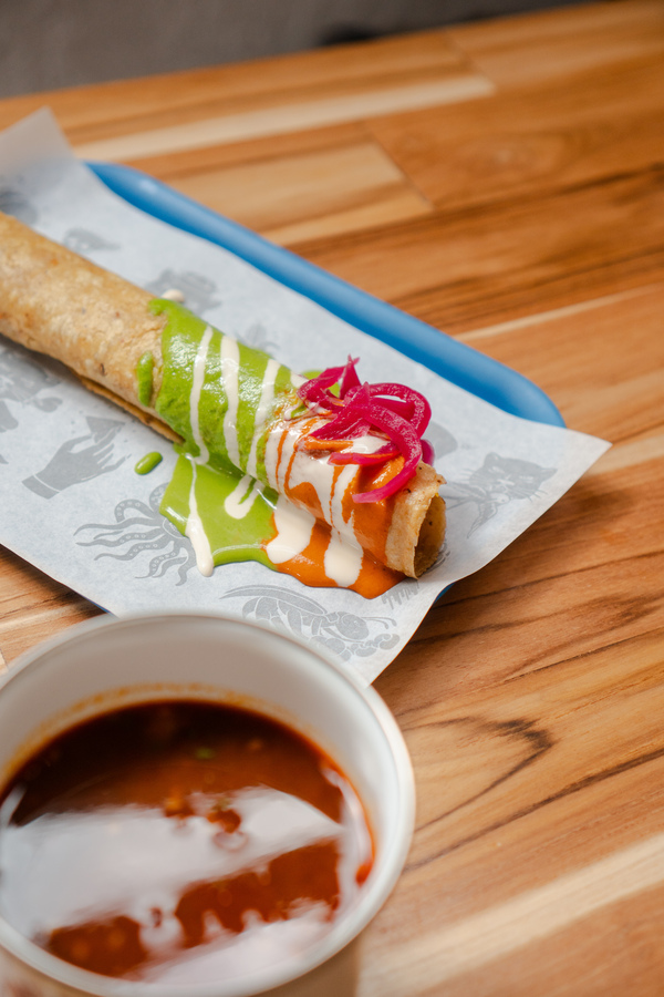 Tortilla crocante rellena de birria de res y papa criolla con salsa roja de chipotle, cebollas encurtidas y su caldo poderoso.