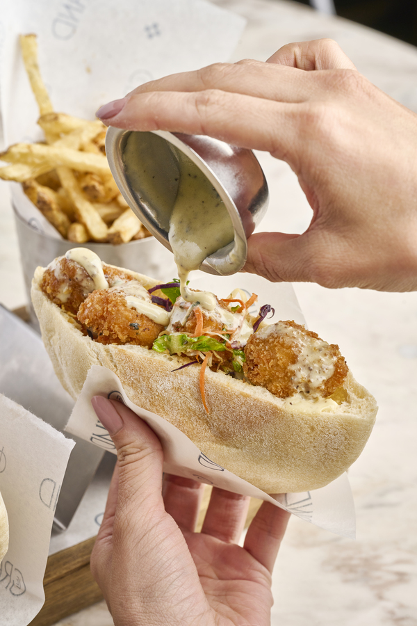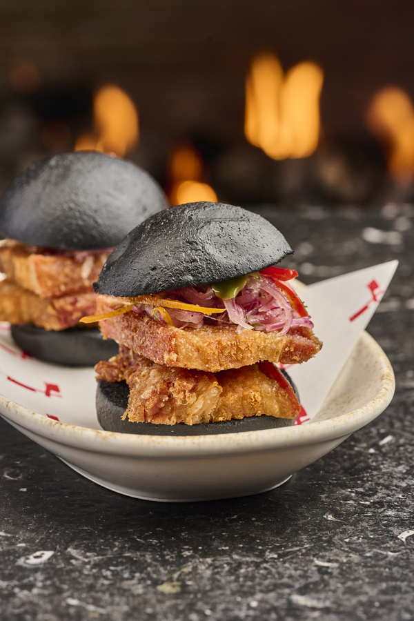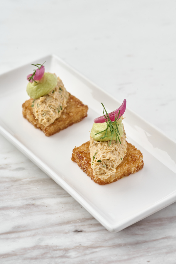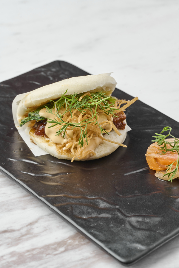 Cangrejo marinado sobre pan brioche dorado y encurtidos.