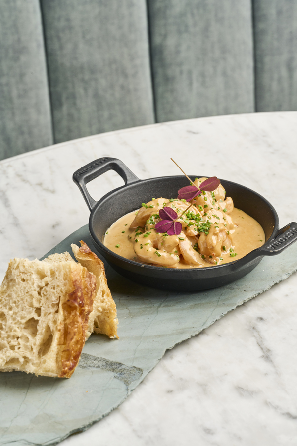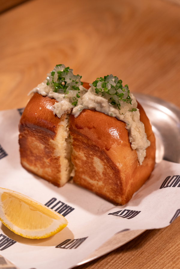 Langosta, langostino, mayonesa japonesa, tabasco, cebollín, en pan brioche.