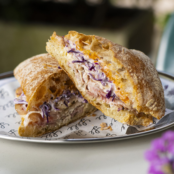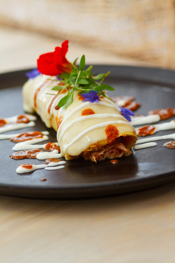 Sanduche de carnitas de cerdo ahumado, frijoles refritos, vegetales, caldo de chiles y tomates tatemados.