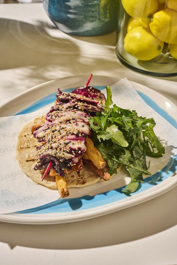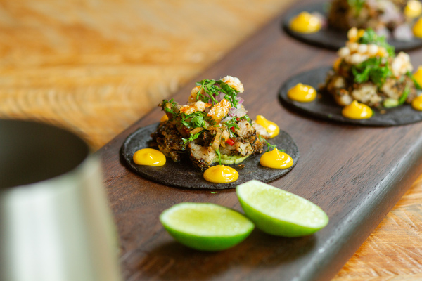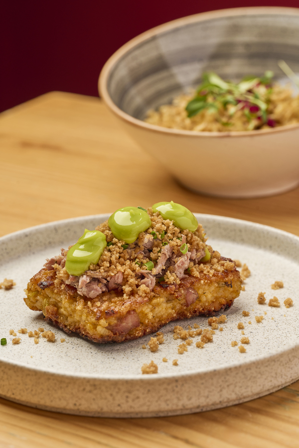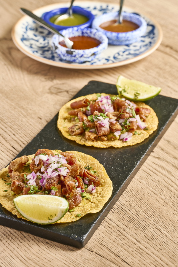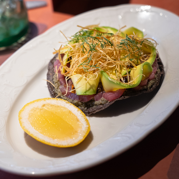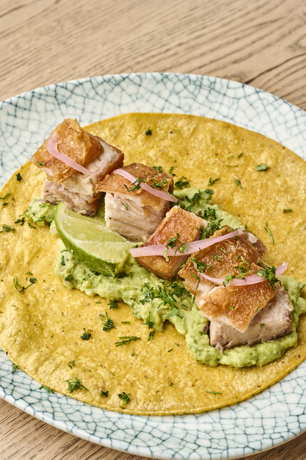 Atún fresco, aguacate, tortilla de maíz, mayonesa de ajo negro y salsa de tomatillo verde.