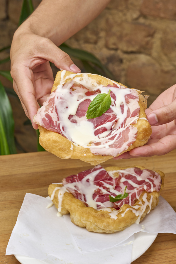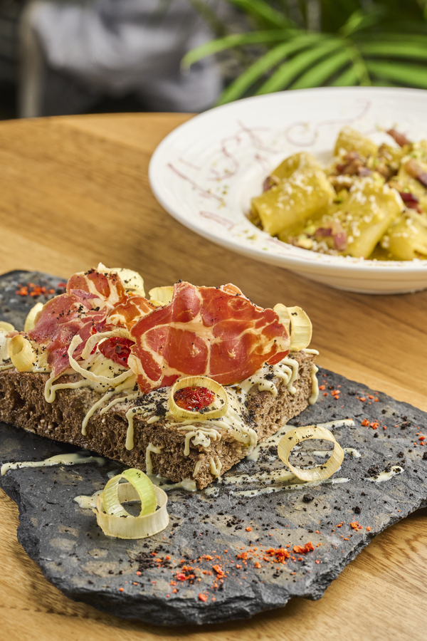 Pizza en pala con crema de gorgonzola, mozzarella fior di latte, coppa, puerro crocante y tierra de aceitunas negras.