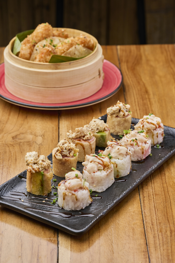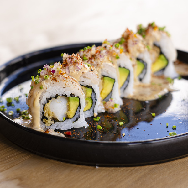 Relleno con aguacate y langostino, empanizado, cubierto con pescado del pacífico, salsa acevichada de la casa, pico de gallo y un toque de togarashi (6 bocados).