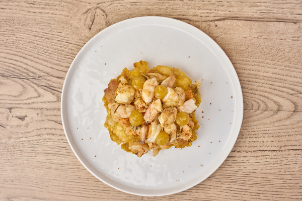 Láminas frescas de pescado en crema parmesana al limón y tostada.