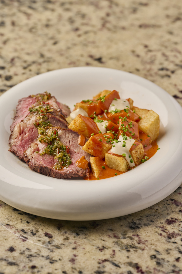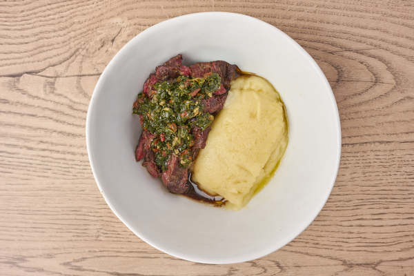 Entraña de res, chimichurri asiático, salsa cítrica, puré de papa con queso suizo.
