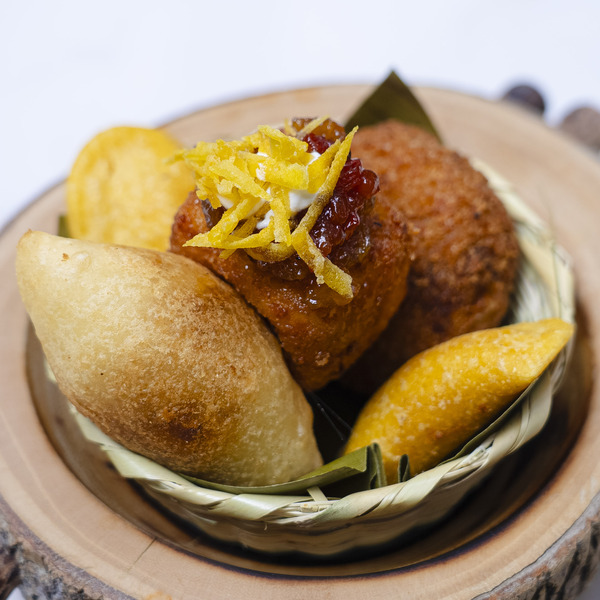 Canasta con típicos colombianos: empanadita de camarón, aborrajado, queso frito y carimañola servidos con ají de lulo, suero y jalea de guayaba.