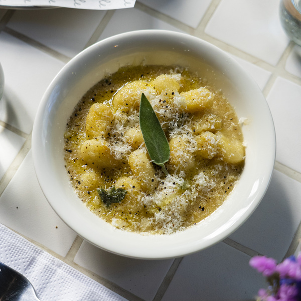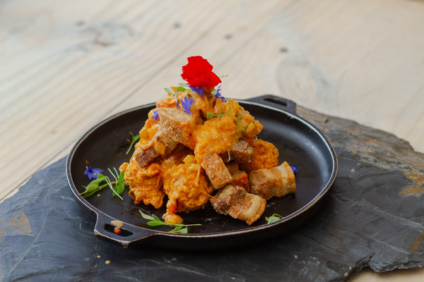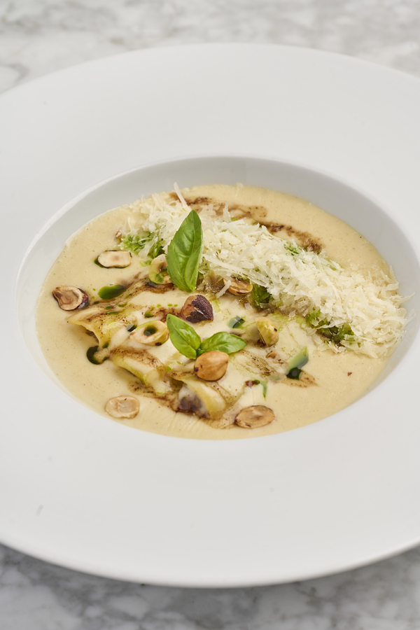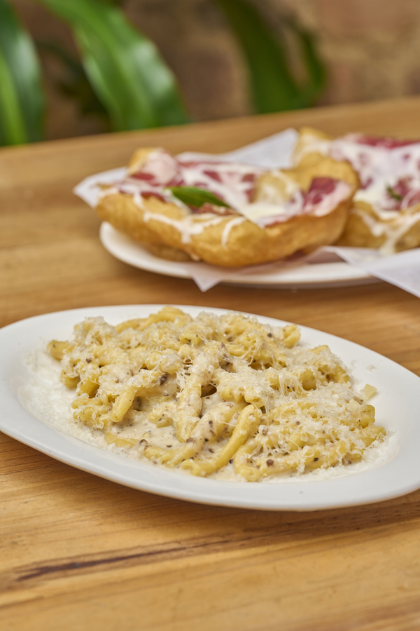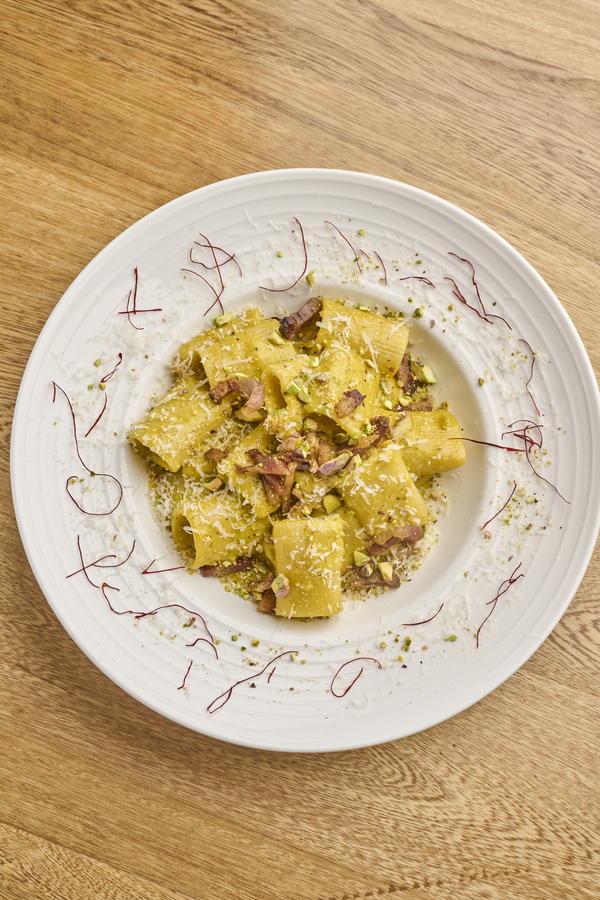 Pasta fresca, yema de huevo, guanciale crocante, pecorino romano DOC, crema de pistachos y trufa.