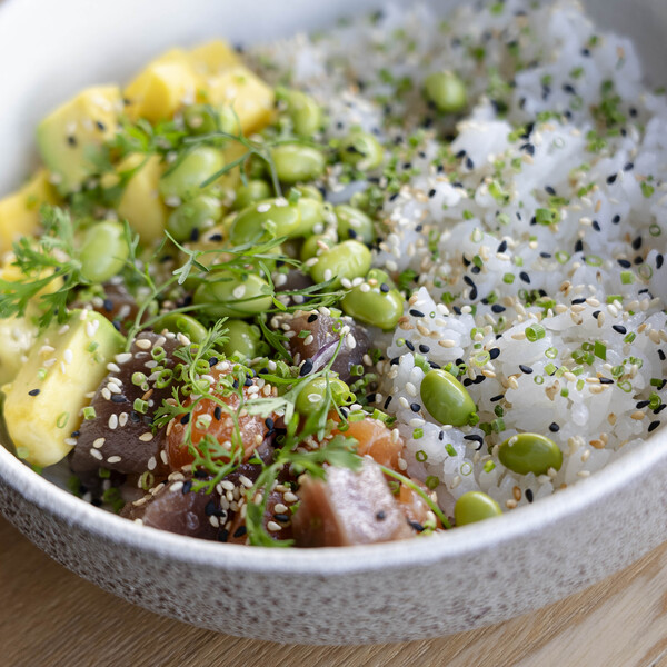 Bowl con salmón y atún frescos, acompañado de edamame, aguacate, mango y arroz de sushi, finalizados con ajonjolí, cilantro y cebollín.