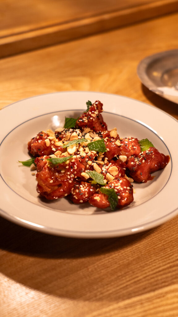 Trozos de pollo frito bañados en salsa gochujang, ajonjolí y maní.