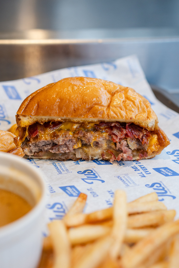 Punta de anca molida, asada al carbón, queso cheddar, pepinillos, lechuga, cebolla y salsa de la casa.
