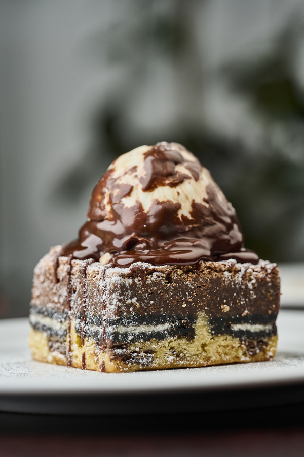 Brownie, oreo, galleta, helado de vainilla y ganache de chocolate.