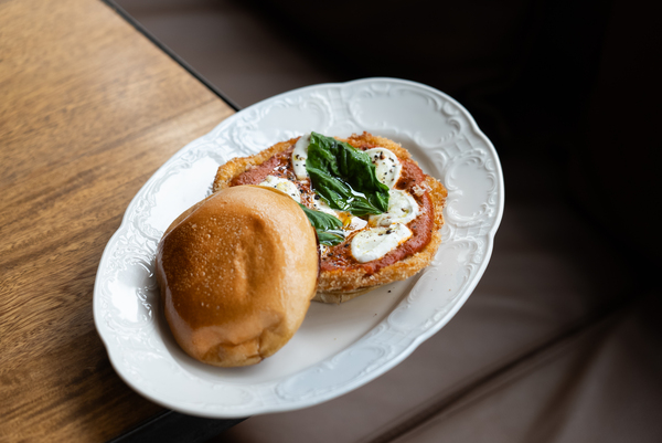 Salsa spicy vodka, mozzarella fresca y albahaca, en pan brioche.