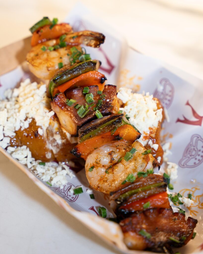 Brocheta de langostino, pulpo y vegetales a la leña zarandeados, acompañado con plátano maduro y suero costeño.