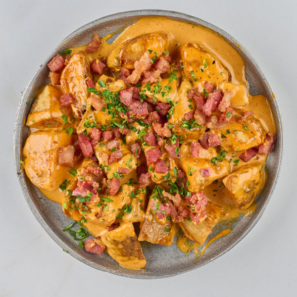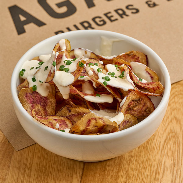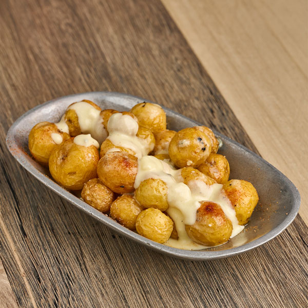 Papas nativas confitadas en doble cocción acompañadas con mayonesa trufada.