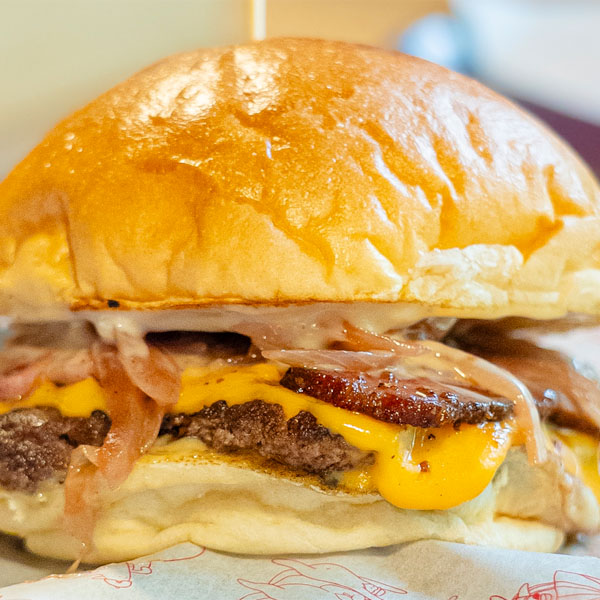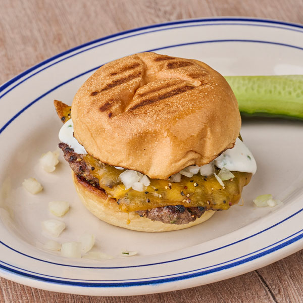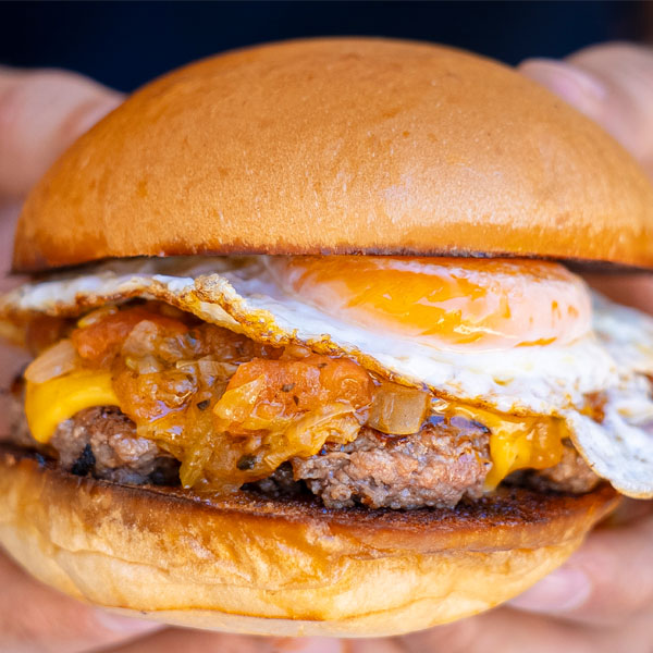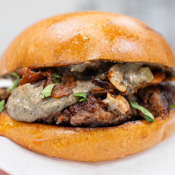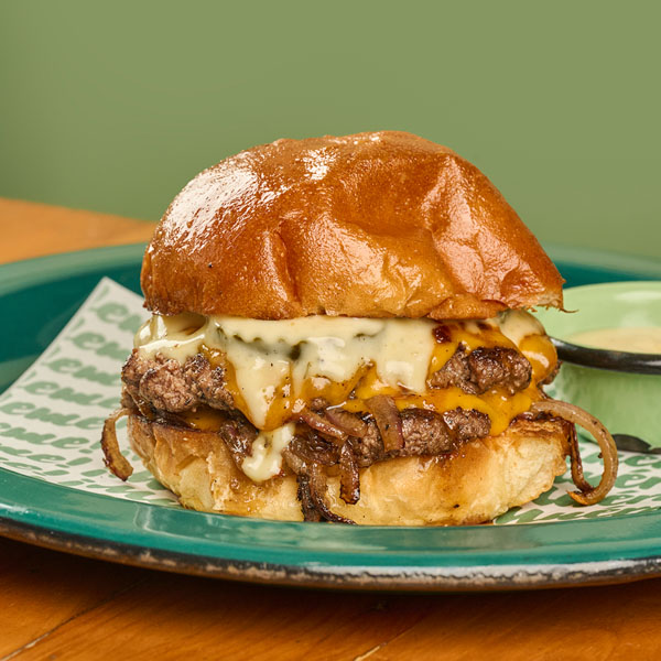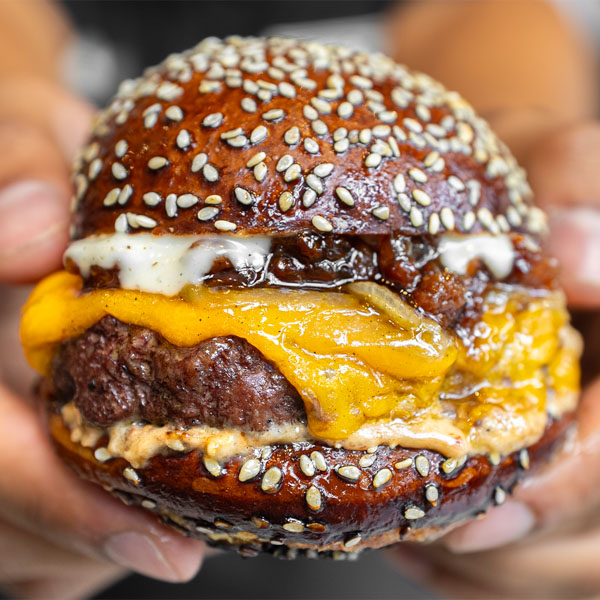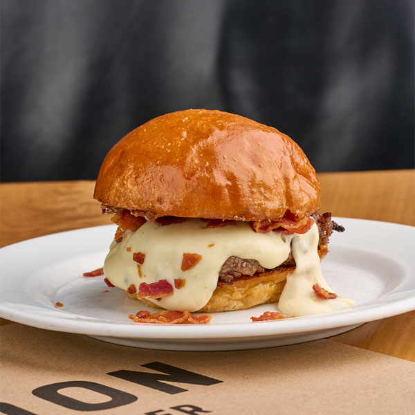 Nuestro blend de carne, queso monterrey Jack, cebollas a la brasa, mantequilla artesanal y salsa de pimienta en pan brioche.