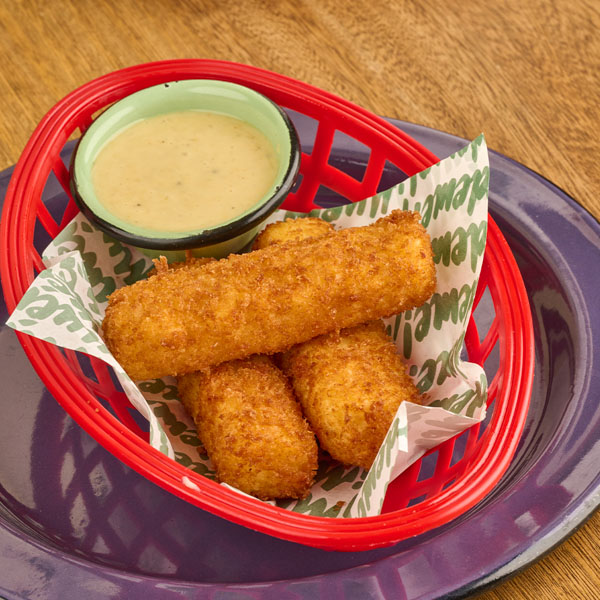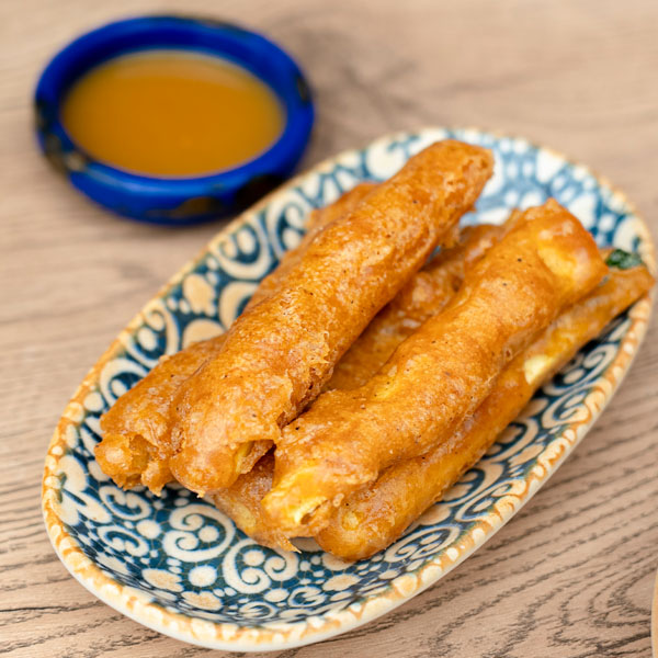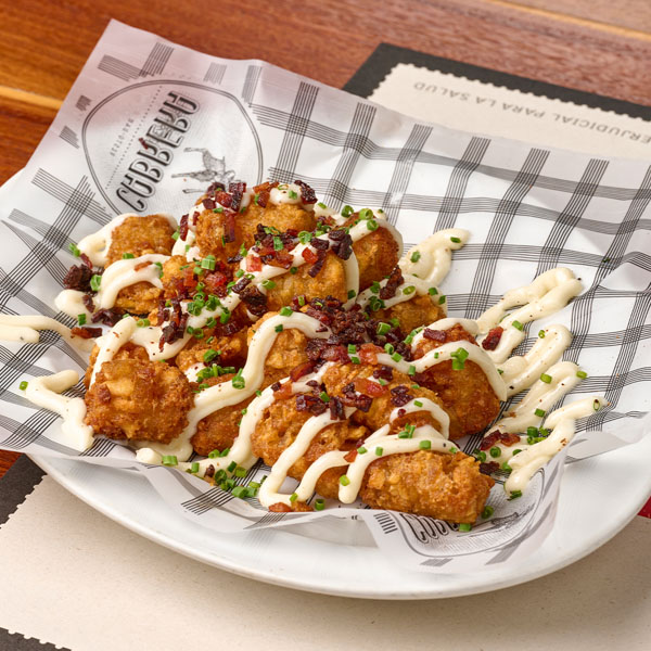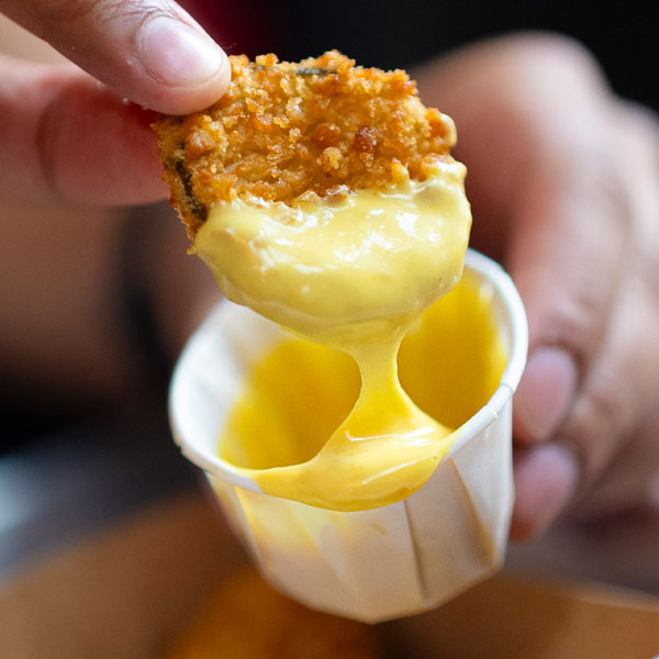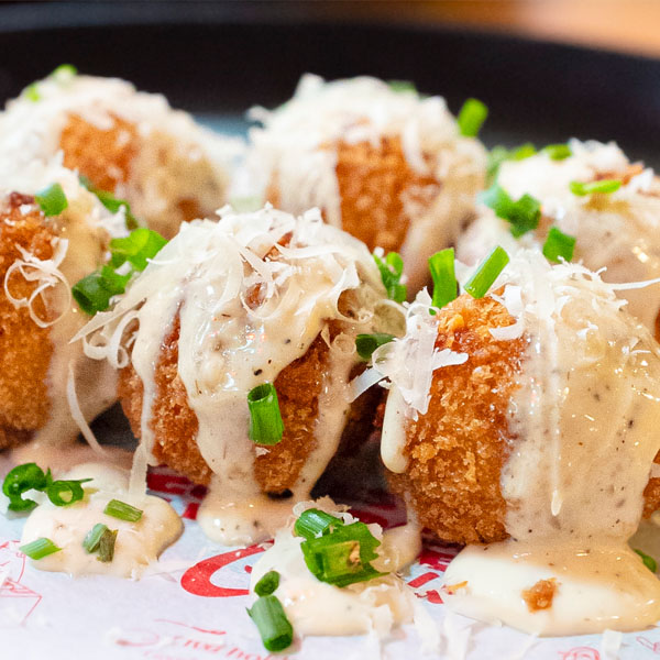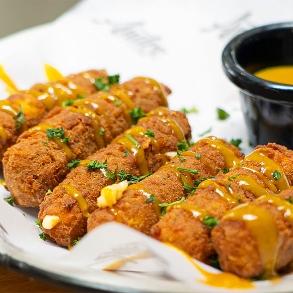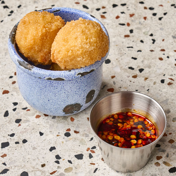 Bolitas fritas de macarrón con queso, apanadas en panko y con un toque de miel picante.