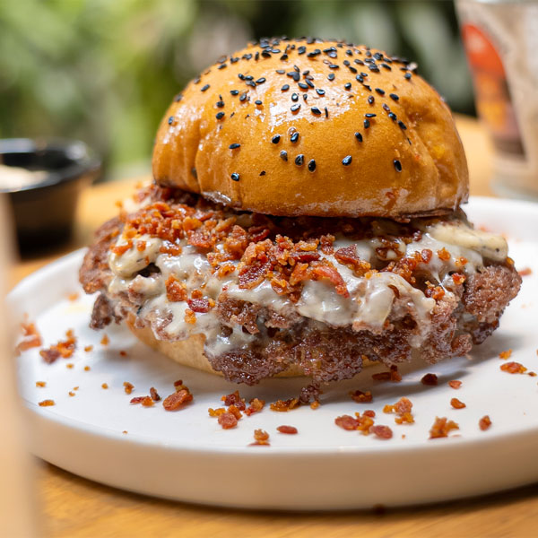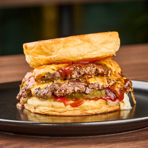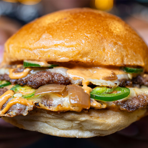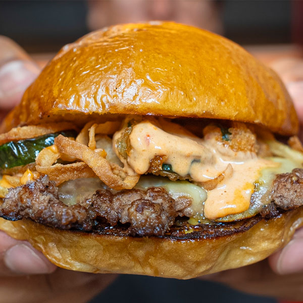 Smash burger con mayobuffalo, queso pepper jack (doble), cebolla crispy, jalapeños apanados y miel mostaza.