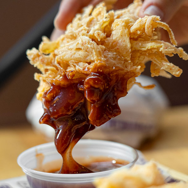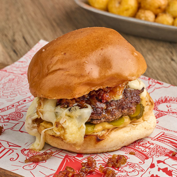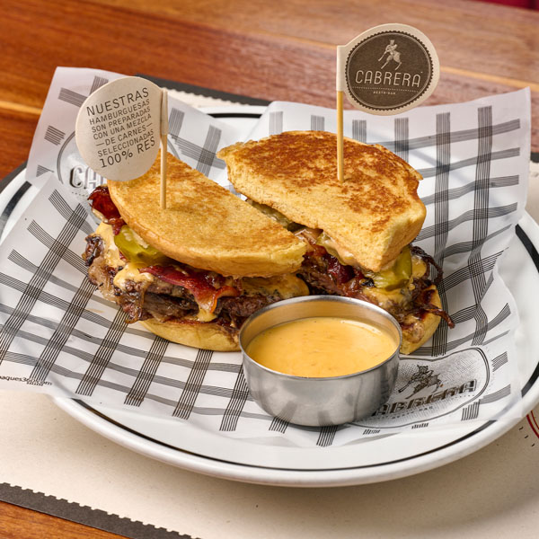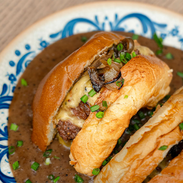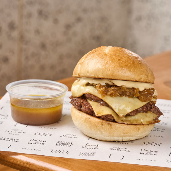 Doble smash de res premium, coronado con queso gruyère fundido y shallots caramelizados, en baguette redondo y tostado, con salsa de carne y mayo Dijon. Se sirve con salsa de carne para dipear.