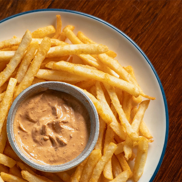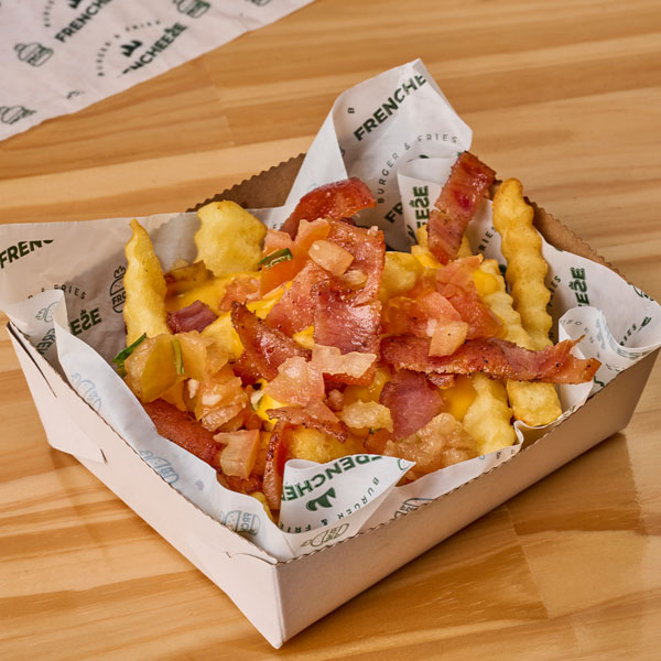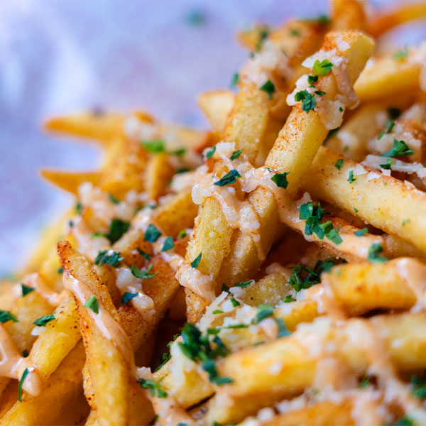 Papas francesas, queso parmesano, perejil, sal marina, paprika y salsa Bensa.