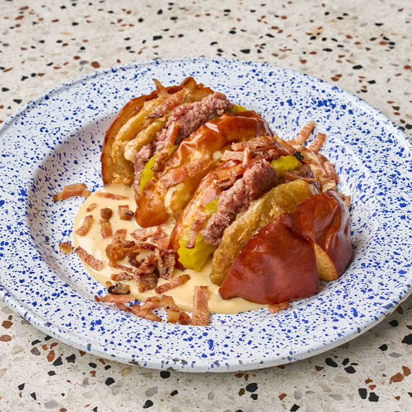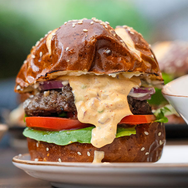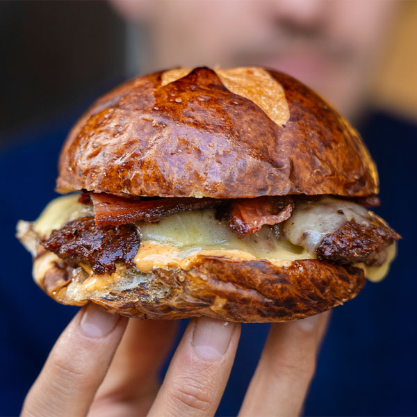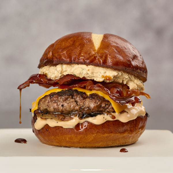 Pan pretzel, carne de res madurada, aros de cebolla crispy y tocineta en trozos. Servida sobre salsa de queso, con reducción de nuestra famosa cerveza pils lager.