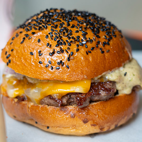 Carne wagyu smash blend, pan golden brioche, queso Colby Jack, kabayaki jam y alioli rostizado.