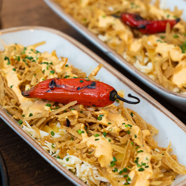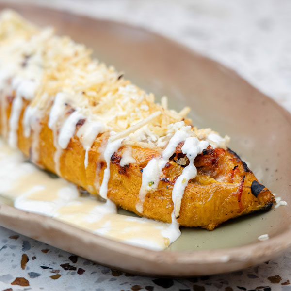 Plátano maduro hecho al carbón, relleno de queso doble crema y queso costeño, coronado con salsa de ajo, suero costeño y papa ripio.
