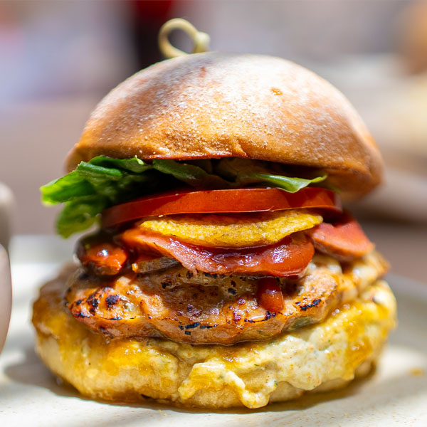 Colita de cuadril tipo angus argentino, con una mermelada de tocineta y cebolla a base de ron sailor jerry, queso mozzarella con salsa clásica de hamburguesa a base de pepinillos, queso crema ligeramente picante que hacen match con un delicioso pan brioche de la casa.