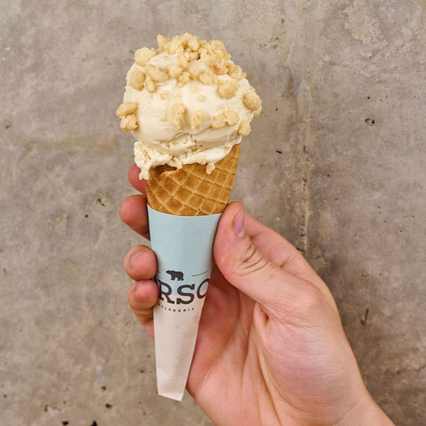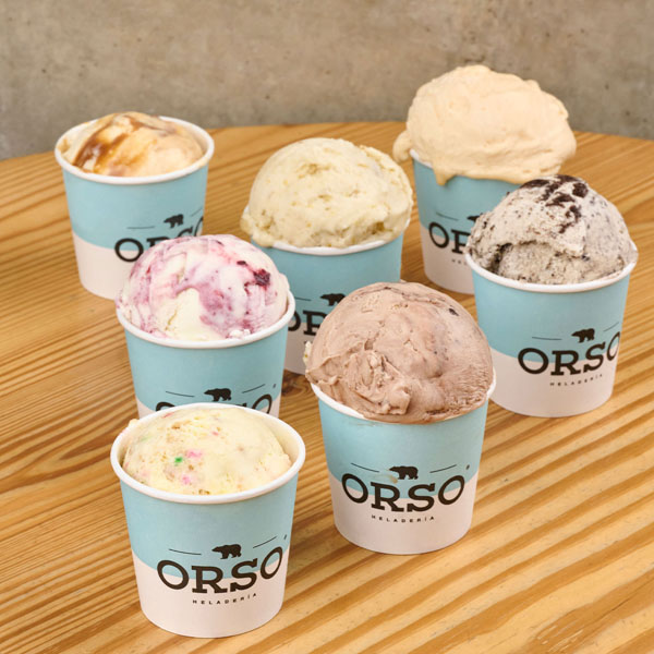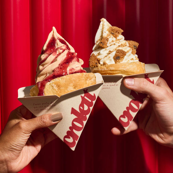 Croasán premium entero hecho con mantequilla, relleno de helado soft y un topping o salsa.