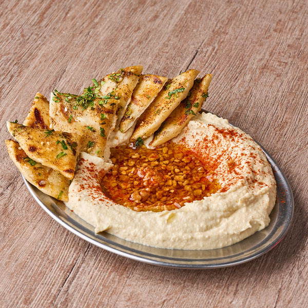 Hummus, aceite de oliva y pita, parrillado con salsa de ajo, sumac y zaatar de pistacho.