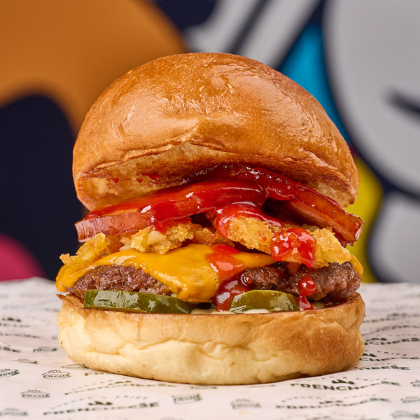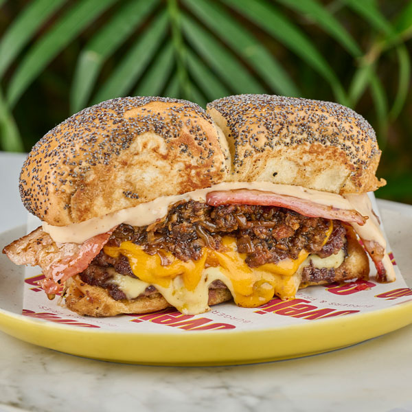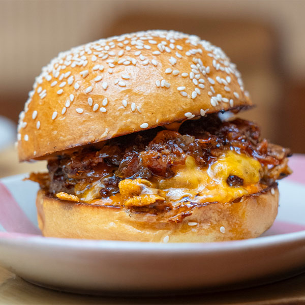 Carne angus jugosa, cheddar fundido, mermelada de tocineta y salsa Gangnam dulce-picante.