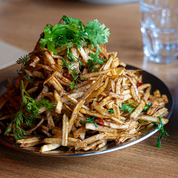 Papas ultradelgadas, sazonadas con sal, tomillo fresco y perejil picado.