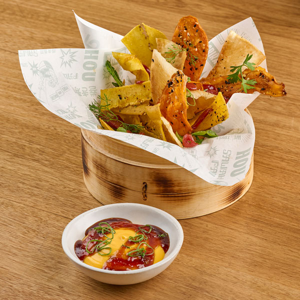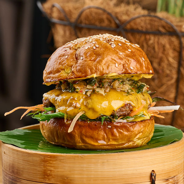 Carne de Short Rib ahumado por 12 horas al horno, con salsa Gochujang, pepinillos, queso cheddar y nuestro pan bao hecho en casa.