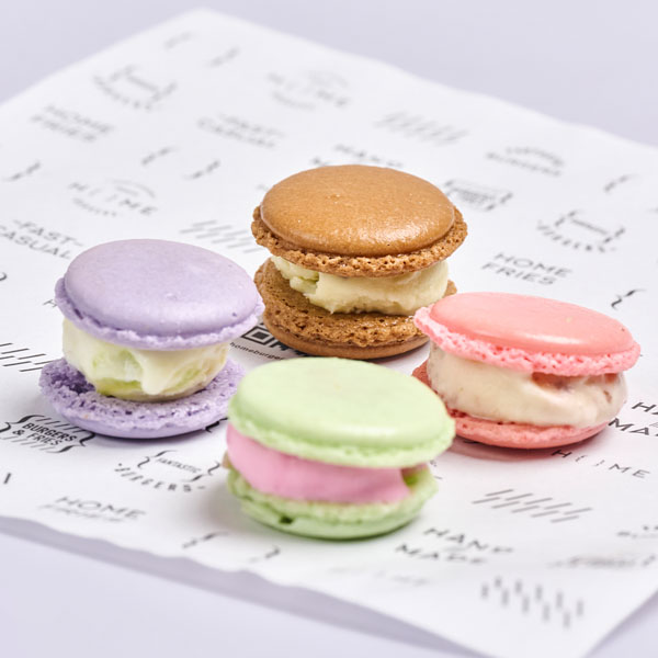 4 Macarons rellenos con nuestra variedad de helado a elección.